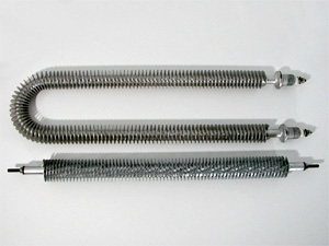 シーズヒーターの発熱部外周にフィンを密着して巻きつけ、放熱効果を大きくしたヒーターです。鋼シース・鋼フィンに耐熱銀粉塗装したものと、ステンレスにステンレスフィン加工したものがあり、主に空気の加熱に用います。又、ヒーターに取付用ブッシングネジを溶接して取り付けする事も出来ます。 |