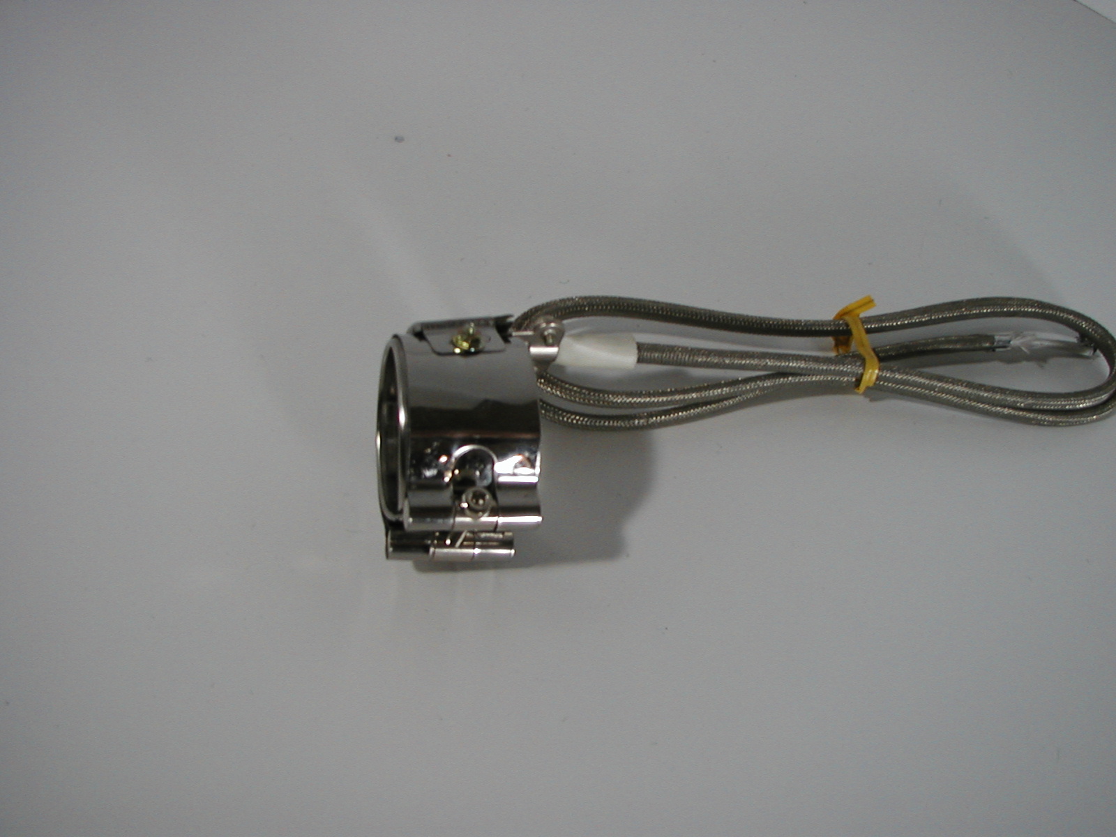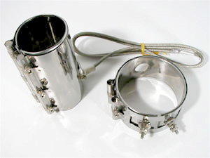 円筒状の非加熱物の外側に密着させて加熱する薄型のヒーターです。耐熱マイカ(雲母)で電熱線を絶縁し、ステンレス鋼板で外装してあります。円形にしたものを1ピース型、半円形ヒーターを2つ合せにしたものを2ピース型といい、いずれもクランプバンドにて締付けます。射出成型機、押出成型機、円筒状金型の加熱に使用されています。 |